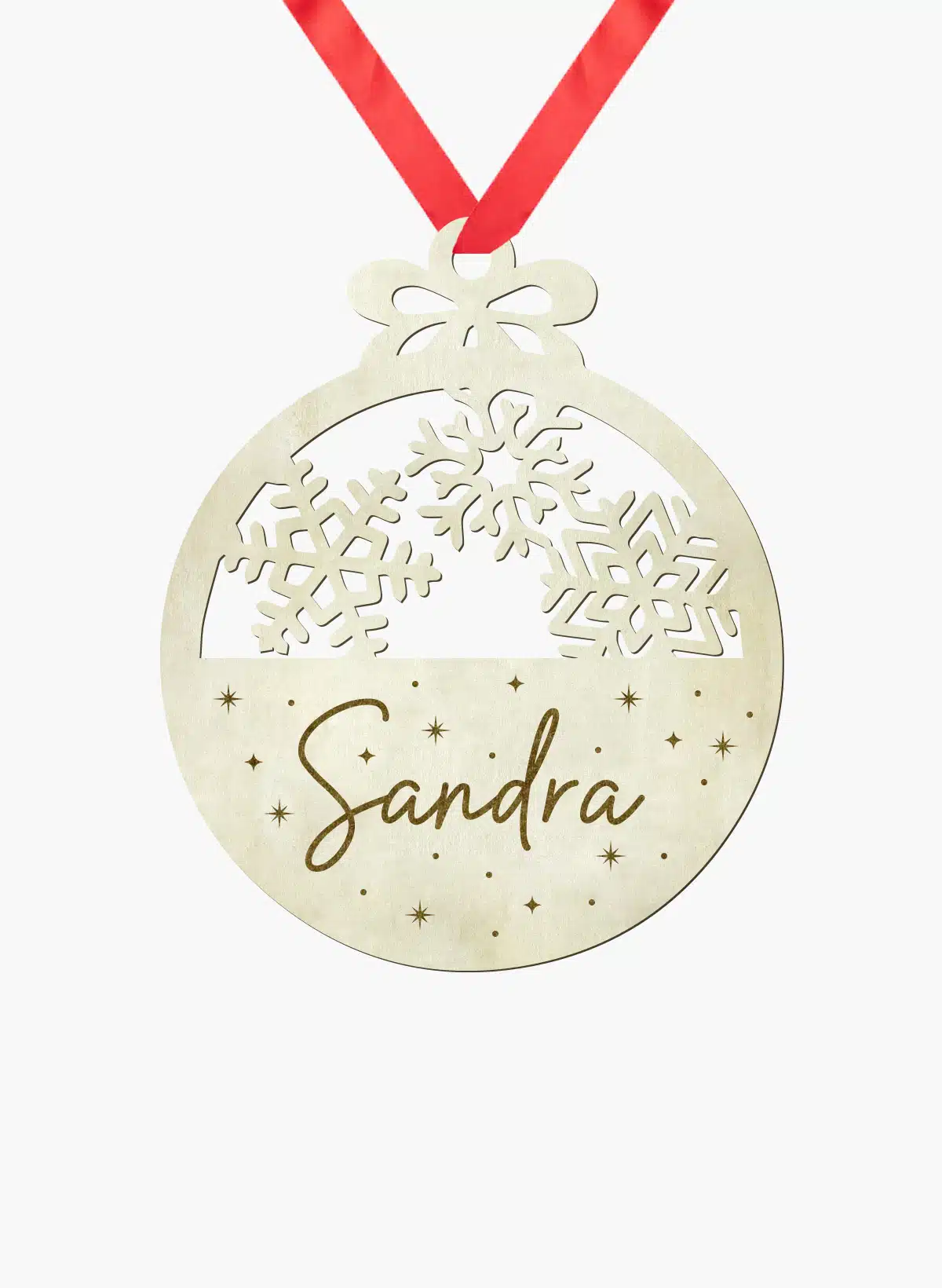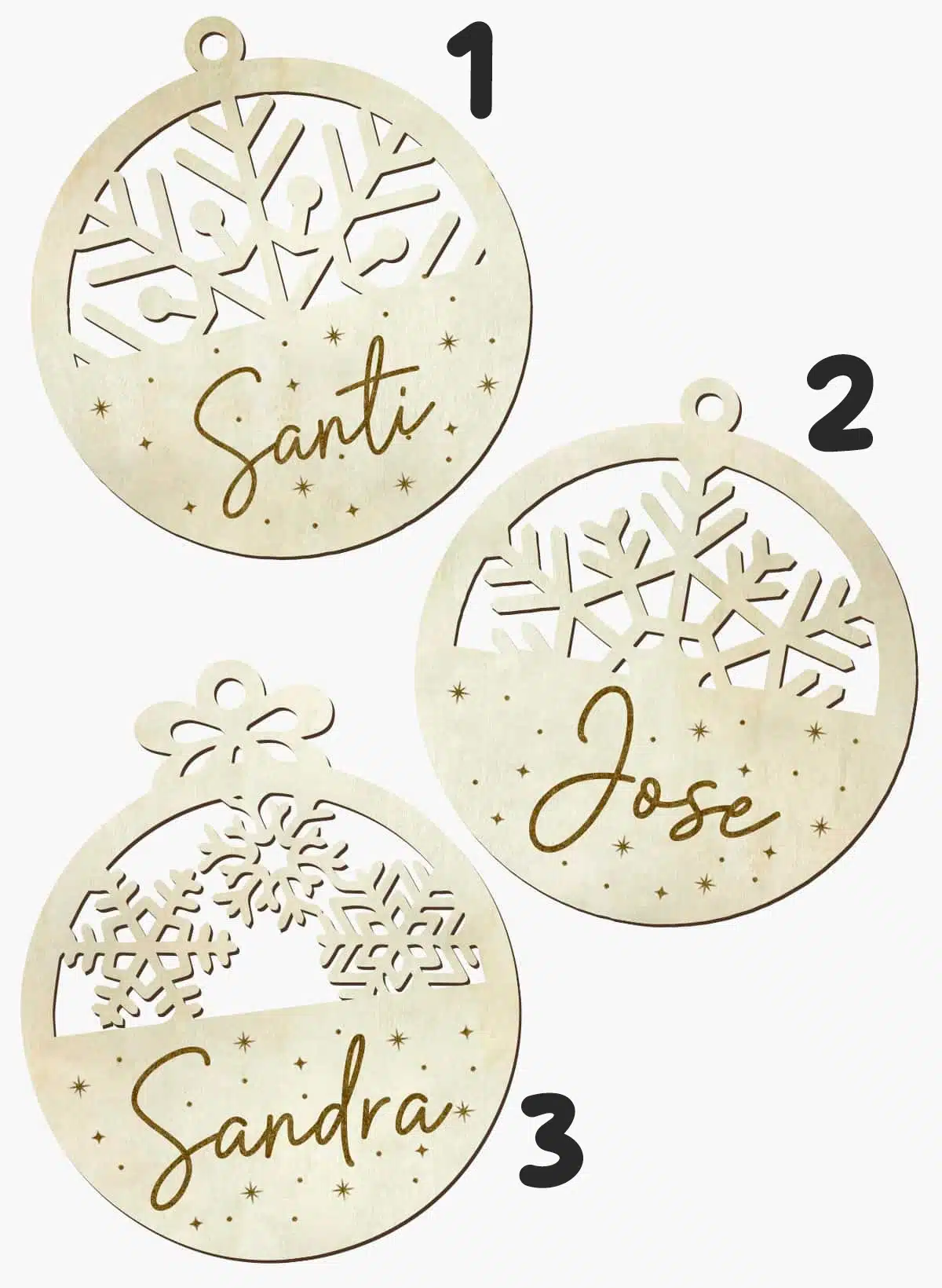 Bola de navidad personalizada, con medidas de 9x9cm o 14x14cm, realizada en madera natural de 3mm de espesor.