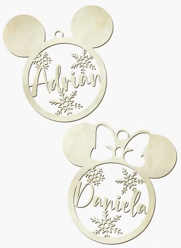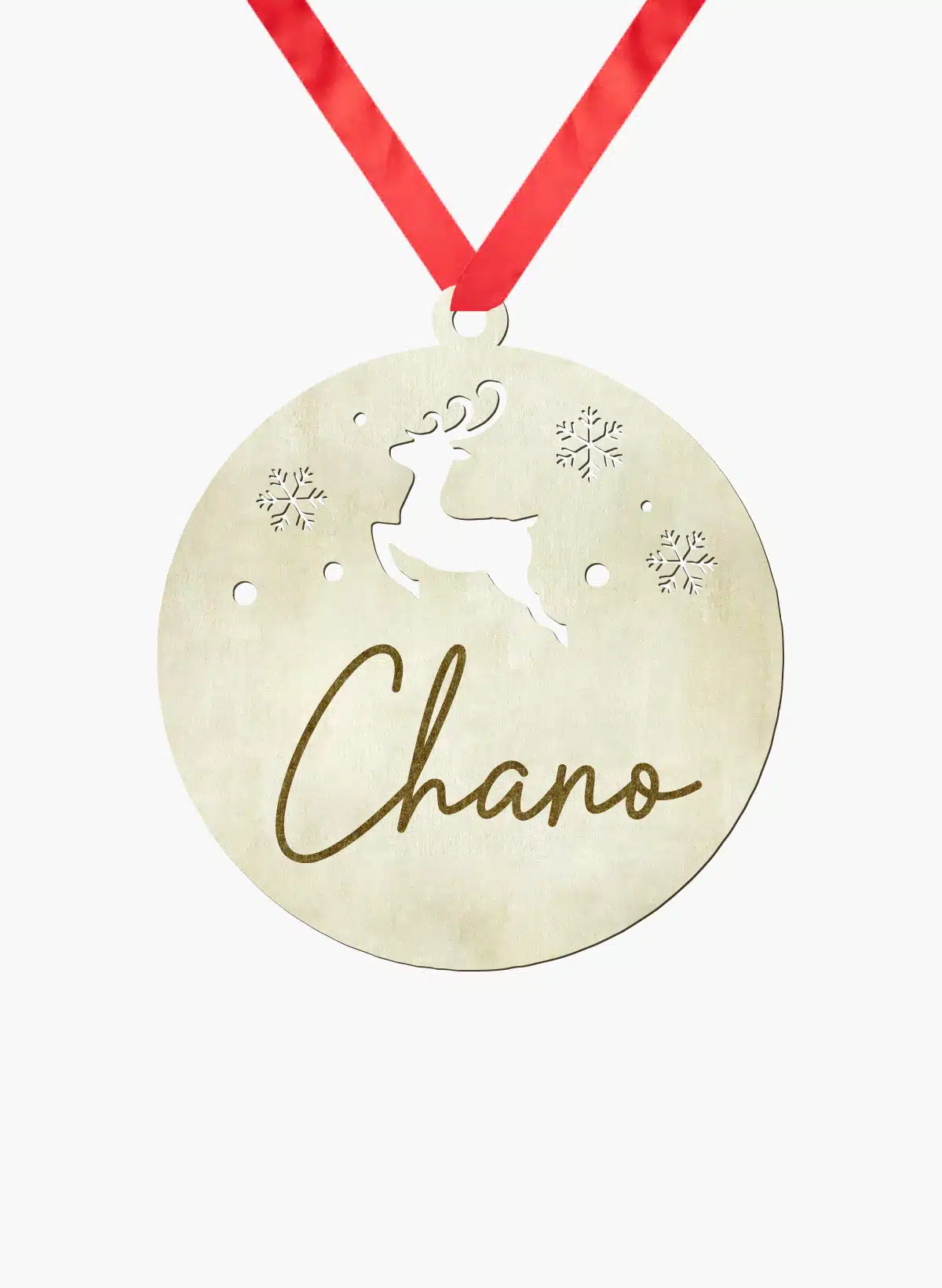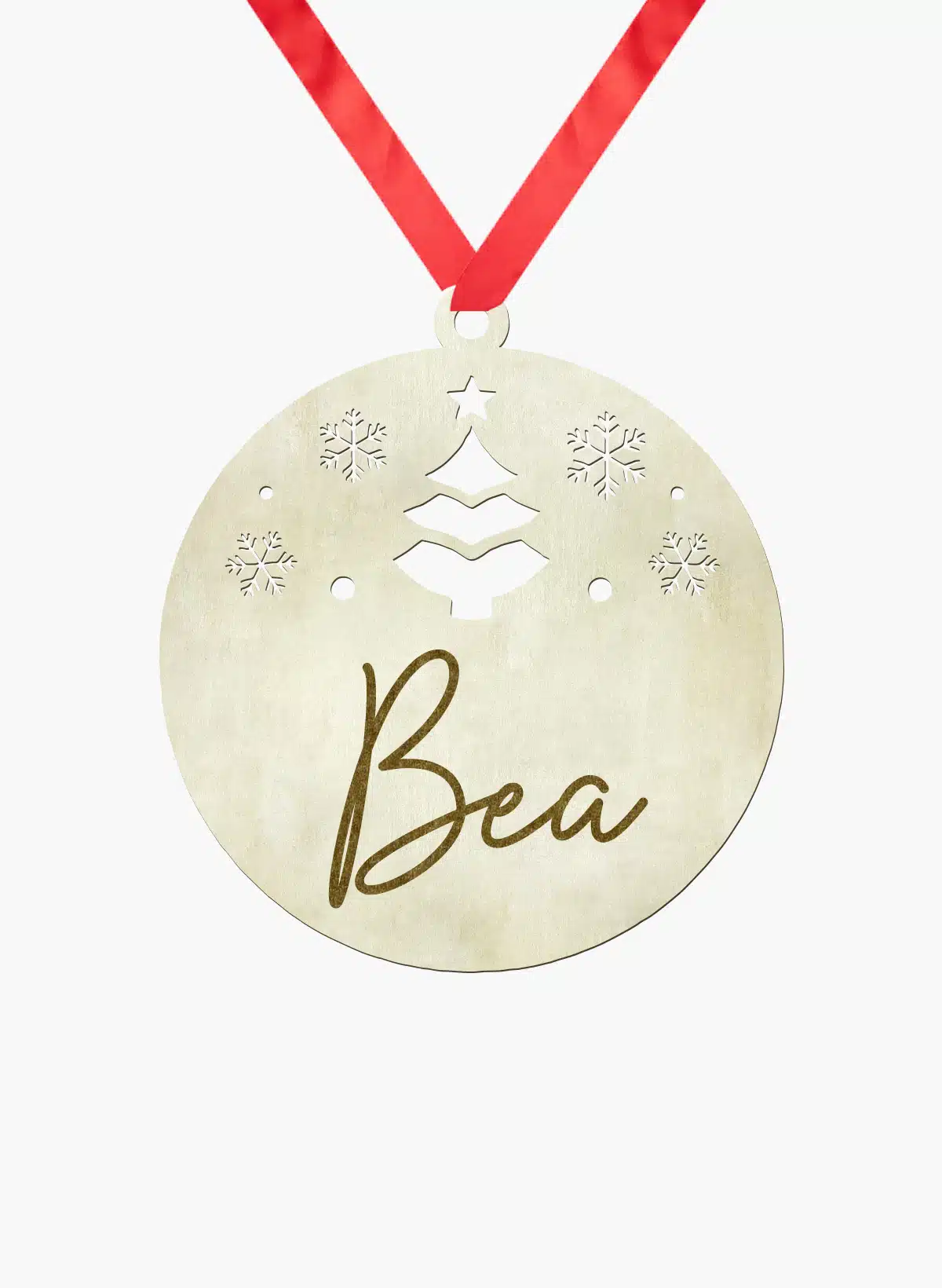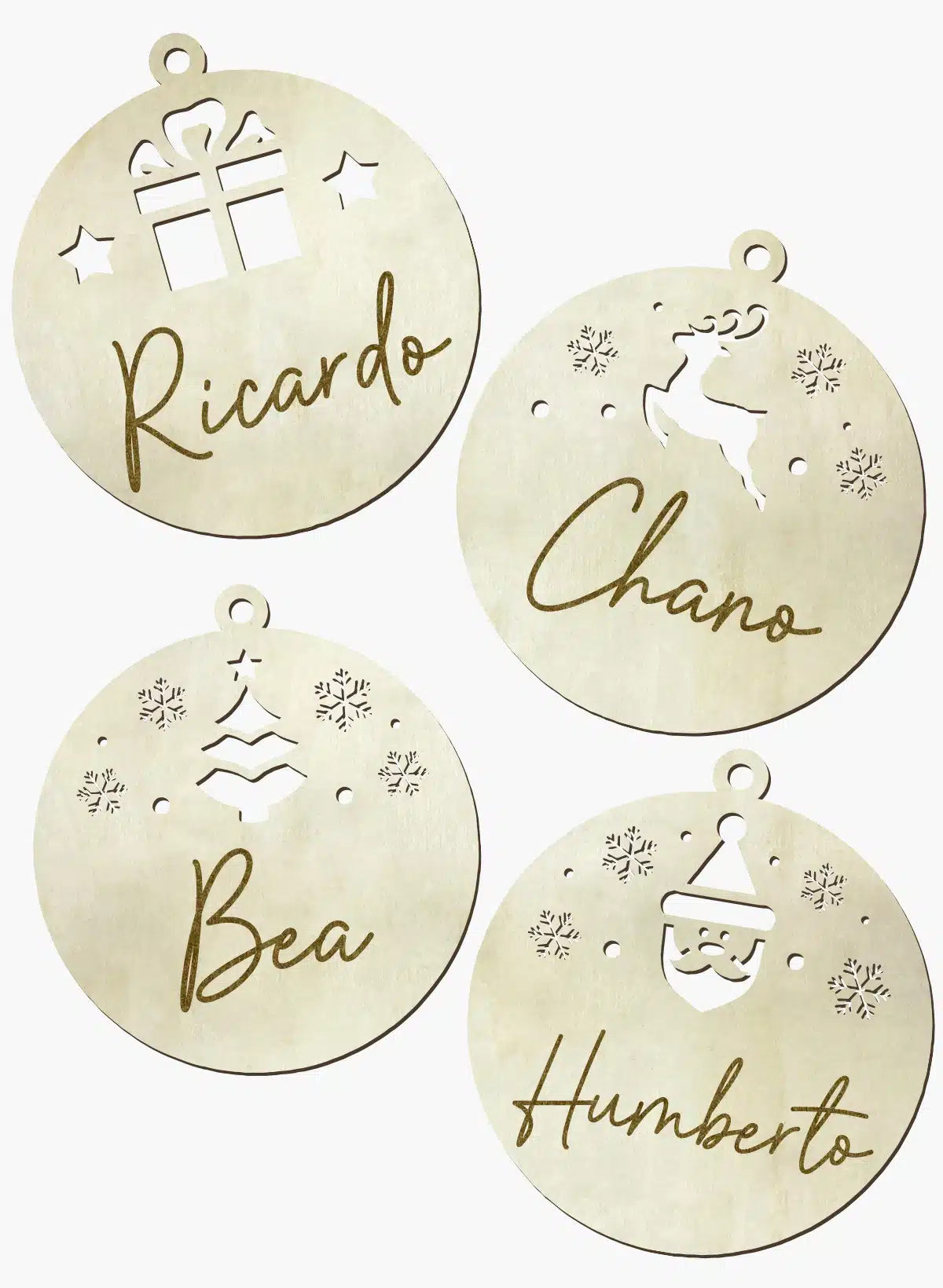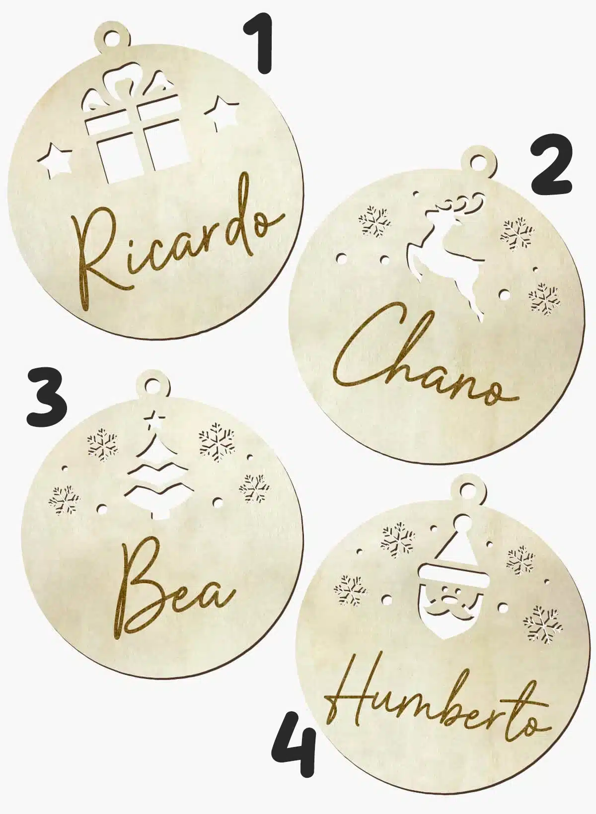 Bola de navidad personalizada, con medidas de 9x9cm o 14x14cm, realizada en madera natural de 3mm de espesor.