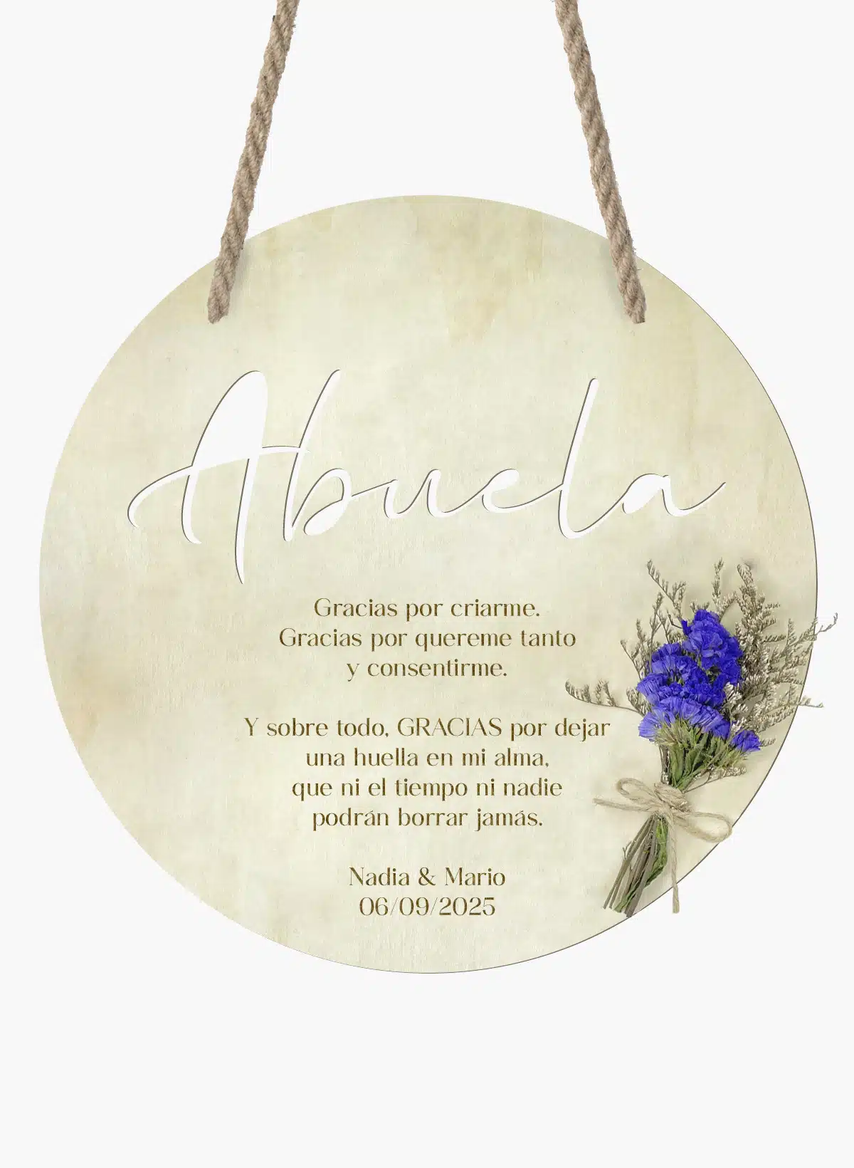 El pedido incluye la placa de madera grabada, y un cordón tipo rafia sin atar, para que puedas atarlo