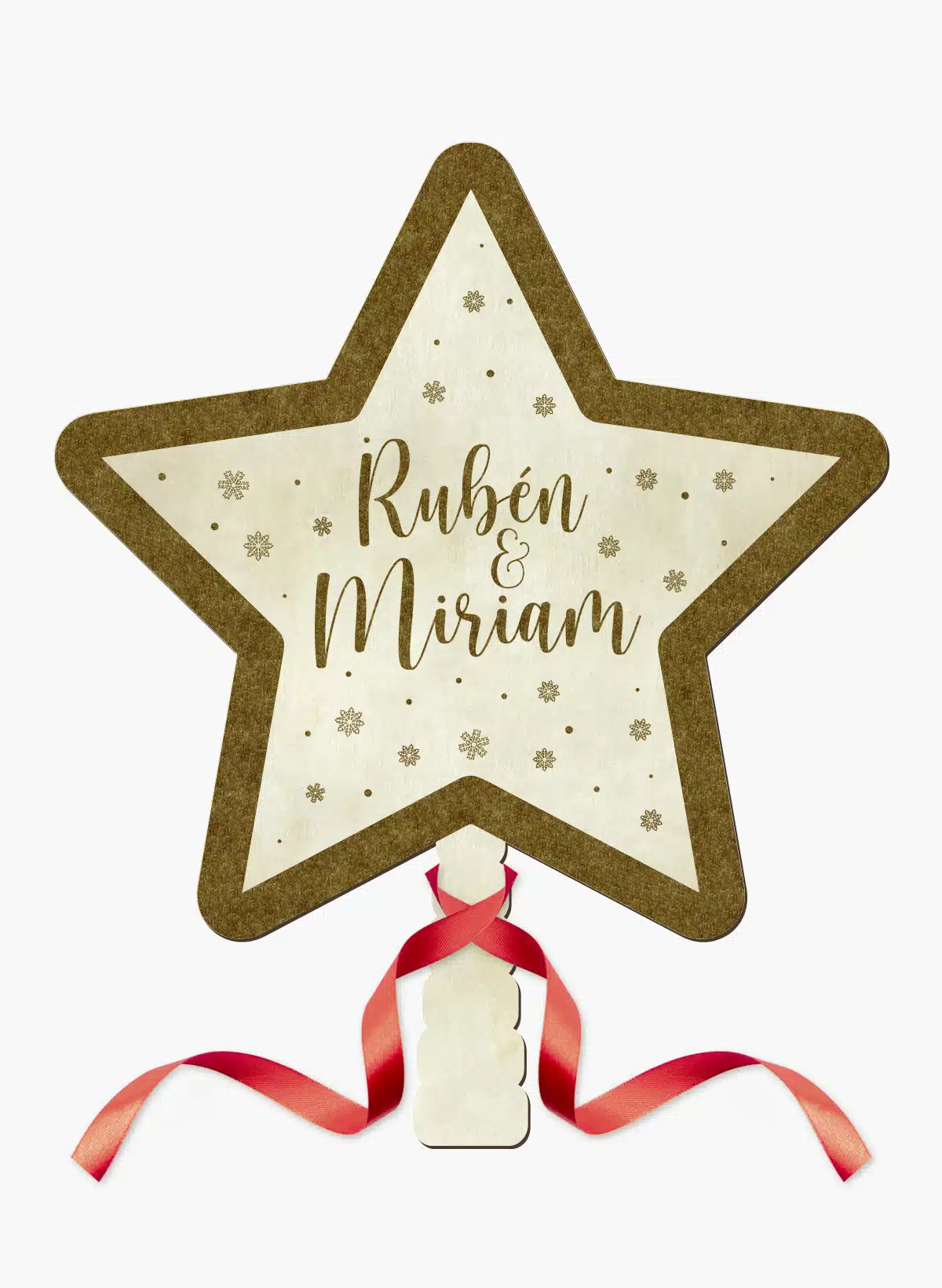 El pedido viene con la estrella de navidad en madera personalizada, un cordel de cinta roja atado al apoyo para que lo puedas atar a la parte alta del árbol y empaquetado individualmente en una bolsa tipo celofán.