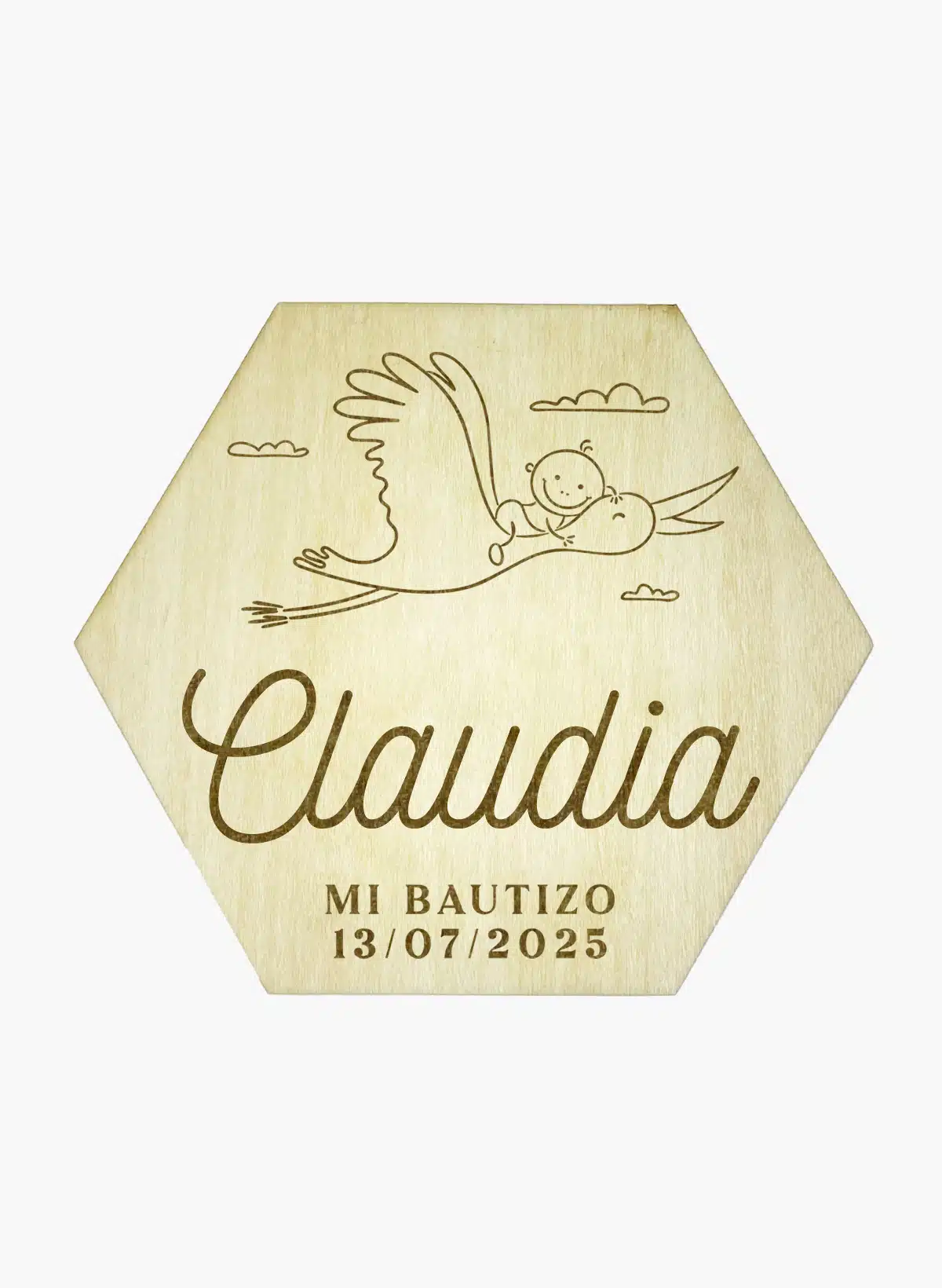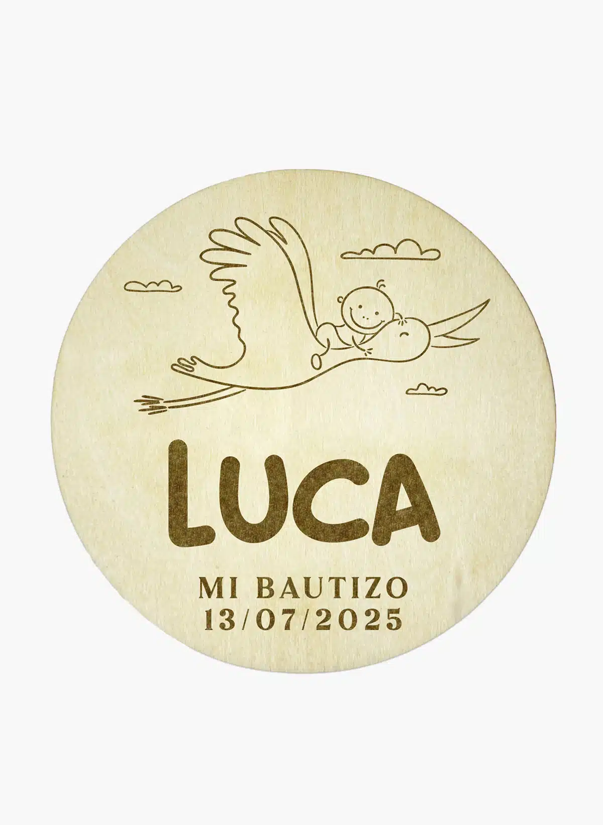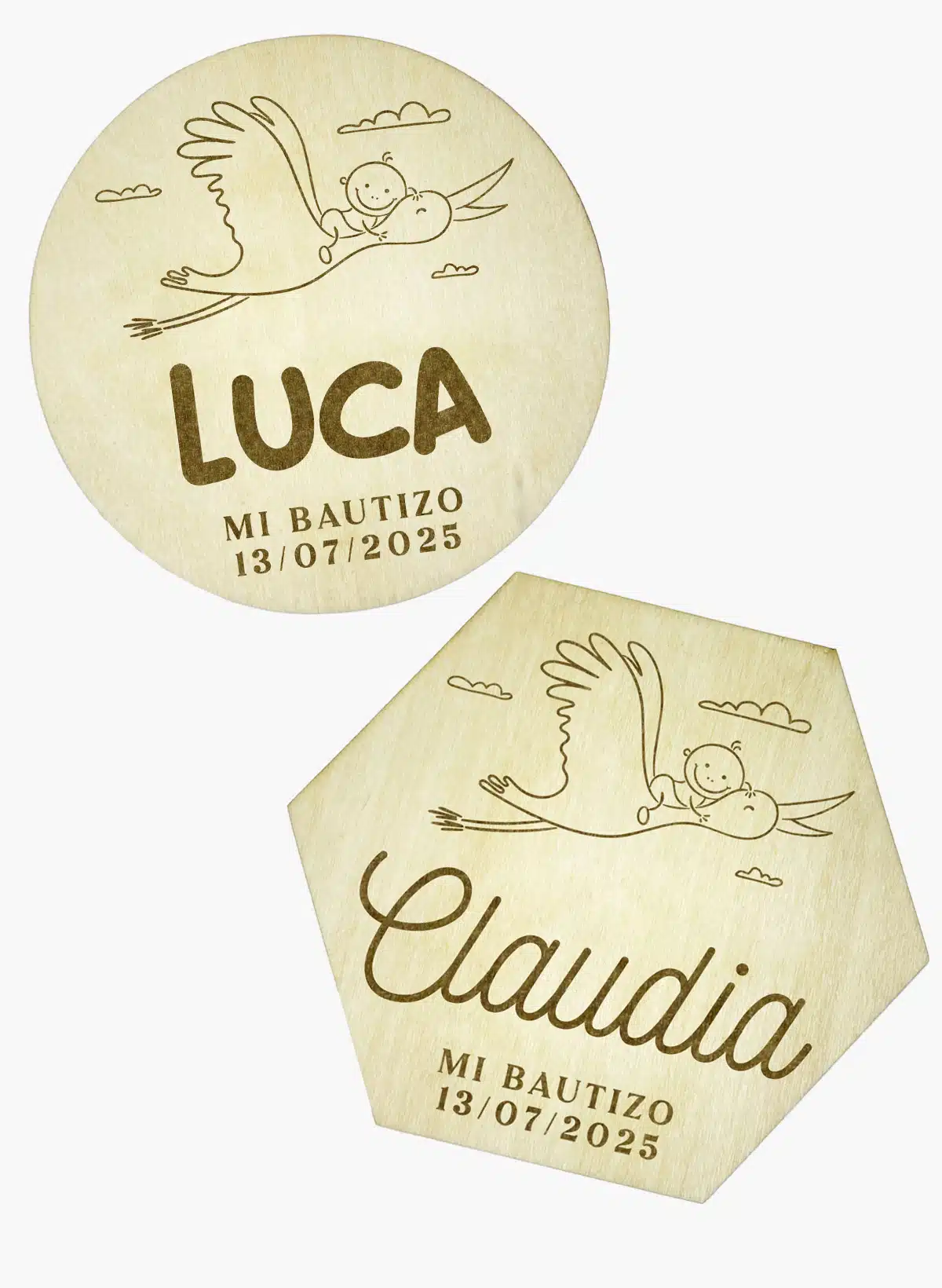 Puedes personalizar los imanes con el nombre de tu hijo/a grabado en la madera, junto con el tipo de evento (bautizo, comunión, cumpleaños…) y la fecha del evento.