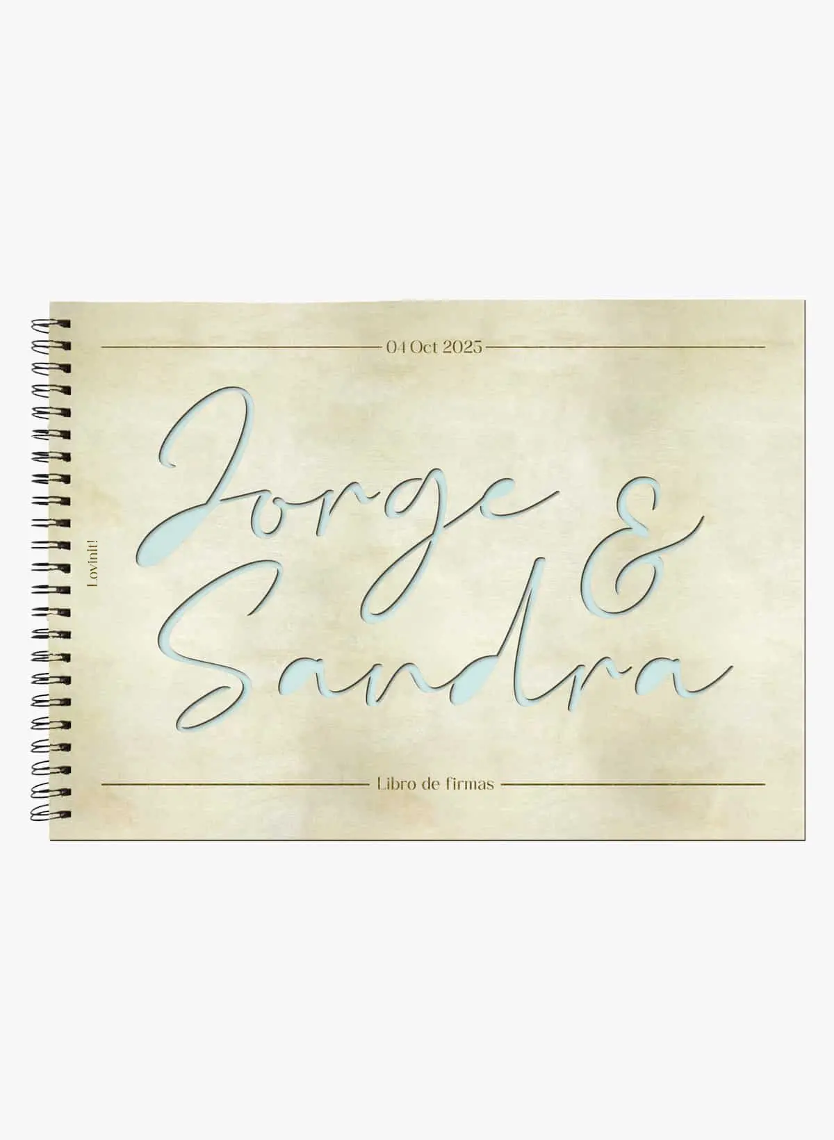 Libro de firmas personalizado, con páginas en tamaño A4 (21×29,7cm), en el que realizamos la portada en madera natural, grabada y elaborada con mucho mimo.