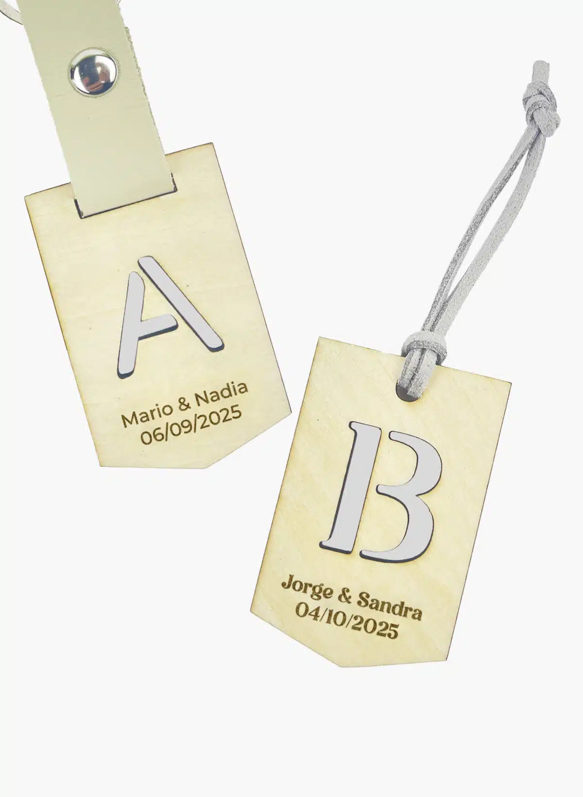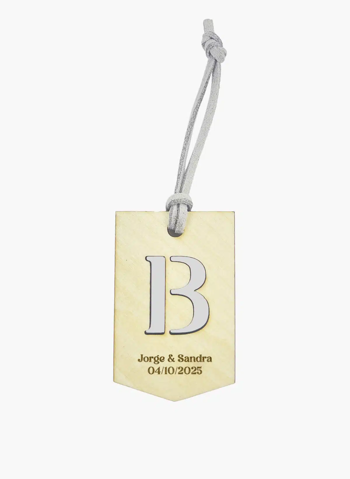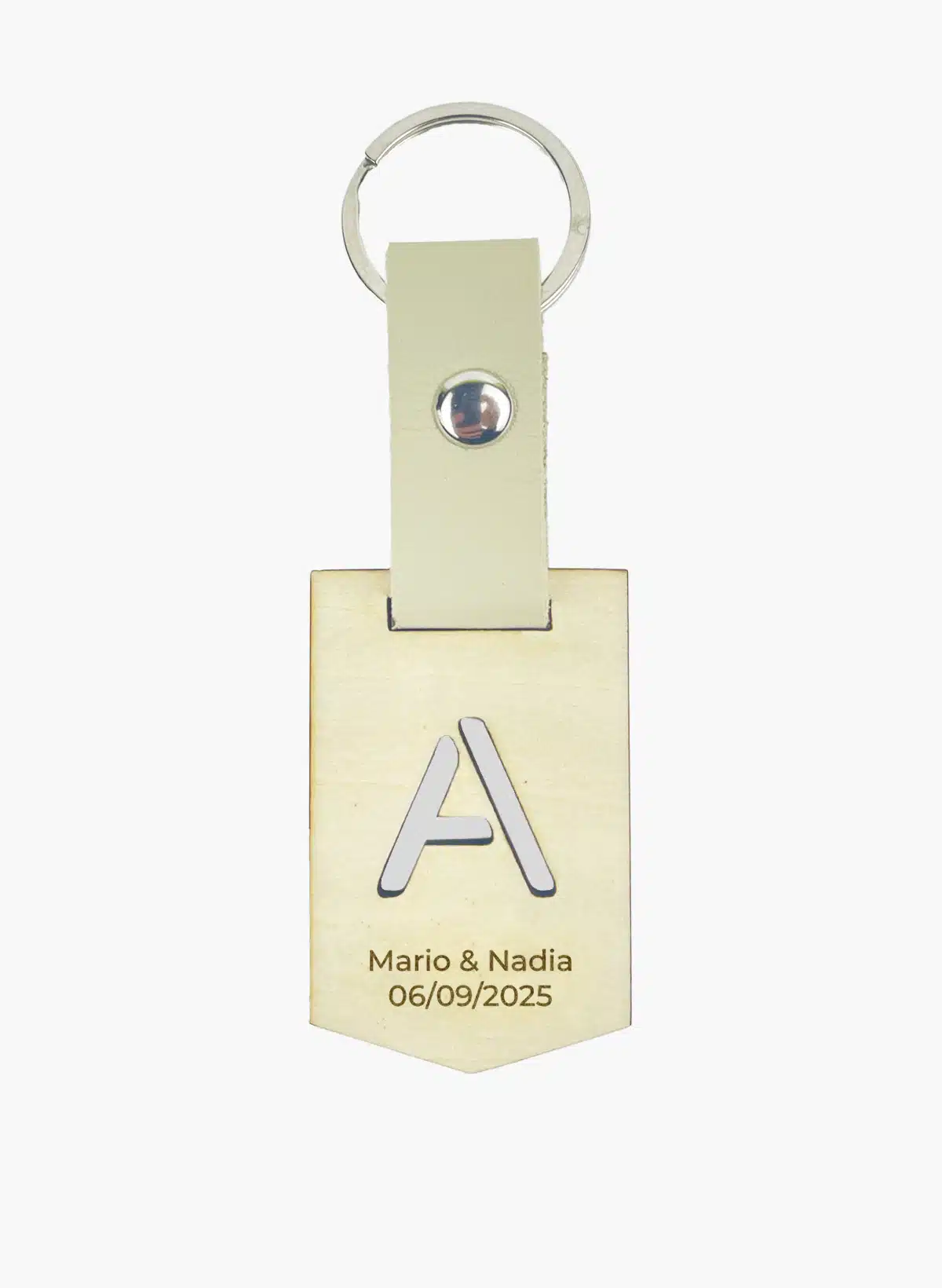 Puedes personalizar el llavero con la inicial de tus invitados recortada en la madera, junto con vuestros nombres o iniciales y la fecha del enlace.