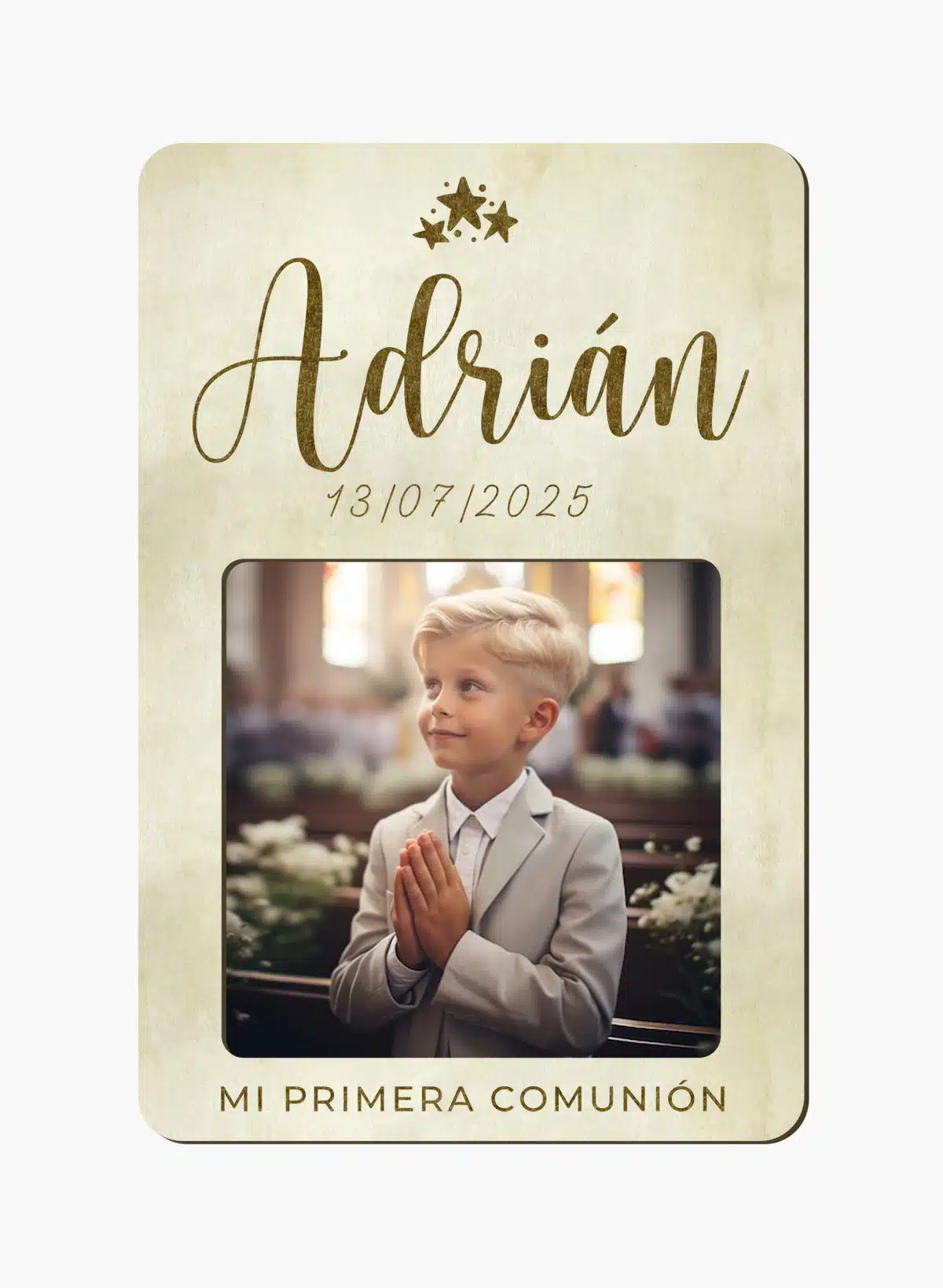 Puedes personalizar los marcos con el nombre de tu hijo/a grabado en la madera, junto con el tipo de evento (bautizo, comunión, cumpleaños…) y la fecha del evento.