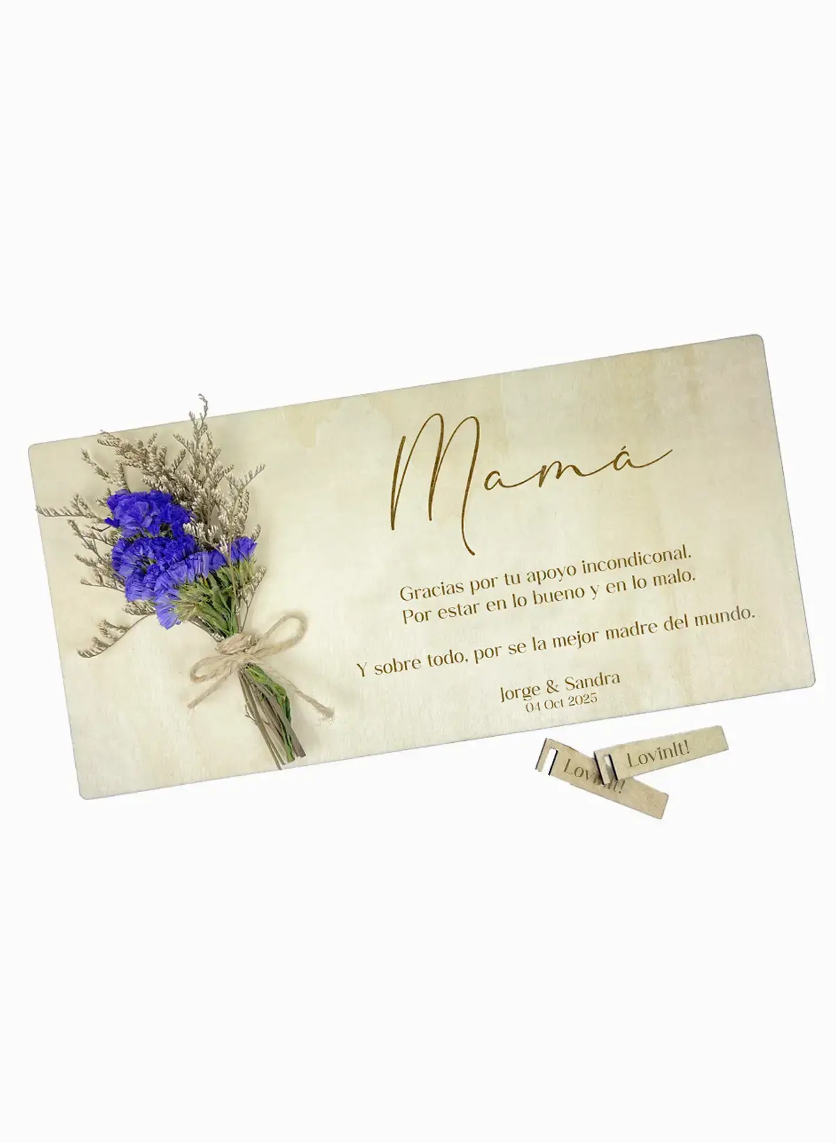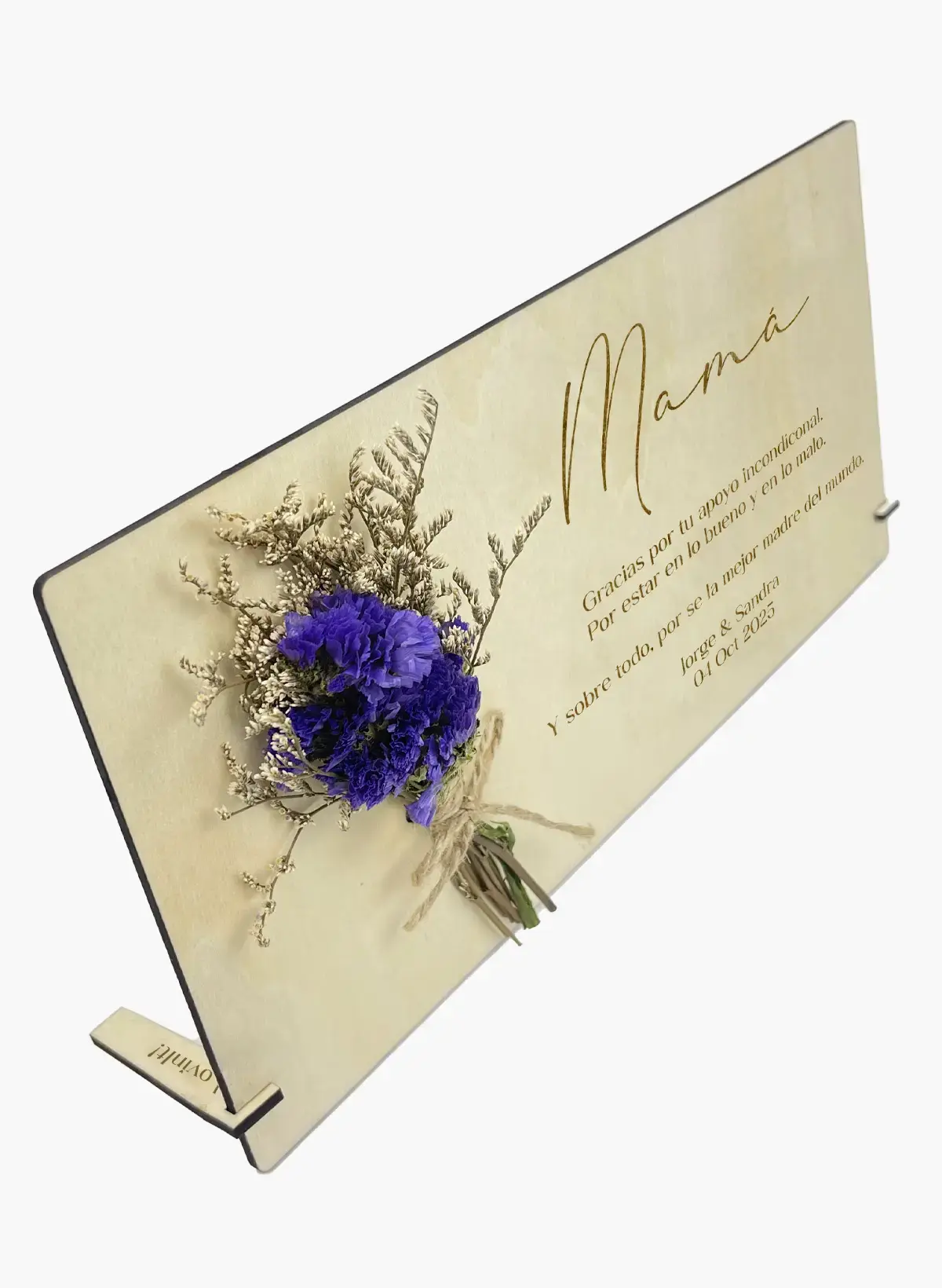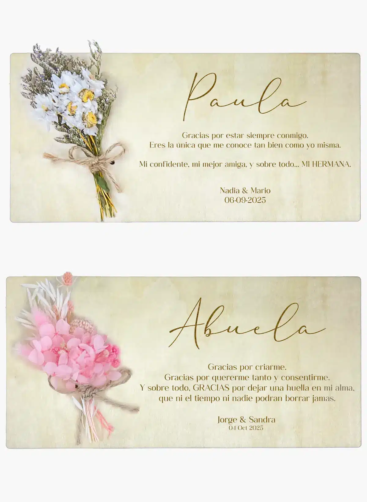 Marco dedicatorio personalizado, con medidas de 28x14cm y realizado en madera natural de 3mm de espesor.